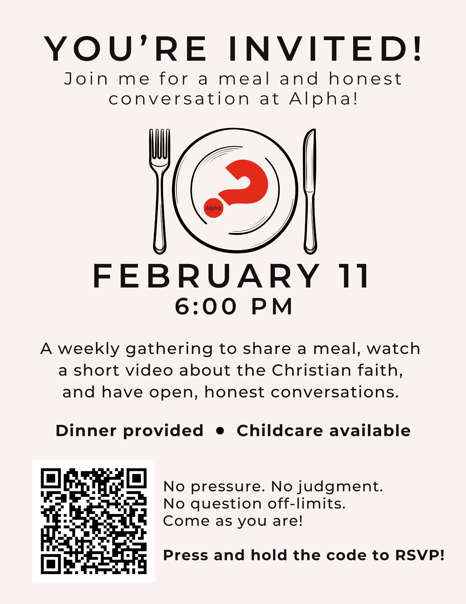 ALPHA COURSE BEGINS FEB 11: Who are you inviting to Alpha? Click here to download a digital invite card. Dinner and childcare is provided - we will meet from 6-8 on Wednesdays from February 11 - April 22. Click here for more information or to register!